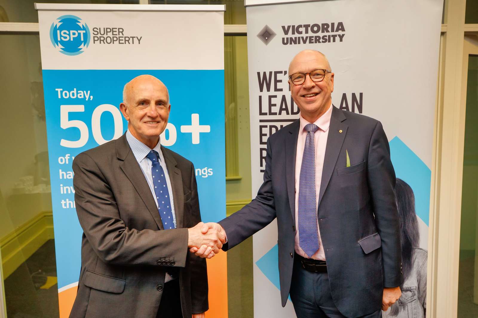 Daryl Browning, Chief Executive Officer of ISPT shakes hands with Victoria University’s Vice-Chancellor and President, Professor Peter Dawkins AO
